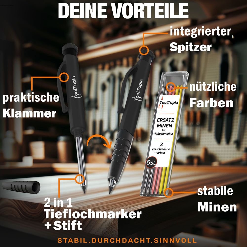 Austauschbare Tiefenminen – Extra langlebig: Das perfekte Tischler Werkzeug für präzise Markierungen. Inkl. 6 Ersatzminen in 3 Farben für kontrastreiche Linien auf jedem Material ist der Baubleistift ideal als Markierungsstift & Bleistift Baustelle